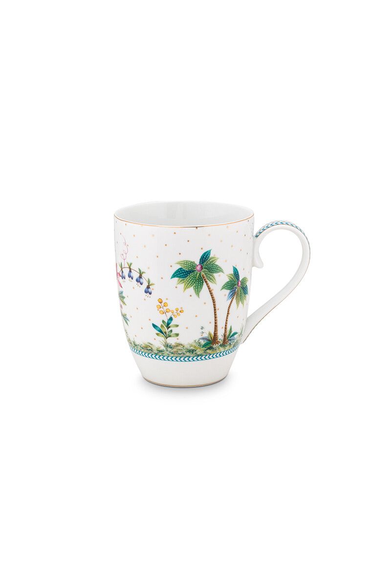 Αυτή η μεγάλη κούπα σας μεταφέρει σε ένα ταξίδι σε ένα πολύτιμο νησί λόγω της διακόσμησης της. Με το λευκό φόντο και τα τροπικά φυτά θα φανταστείτε τον εαυτό σας σε έναν κόσμο γεμάτο φύση. Ένα πουλί πετά πάνω από διάφορα φυτά, δέντρα και πολύχρωμα λουλούδια. Η λαβή αυτής της κούπας είναι διακοσμημένη με μπλε λεπτομέρειες. Επιπλέον, αυτή η κούπα είναι διακοσμημένη με χρυσές κουκκίδες για παιχνιδιάρικο αποτέλεσμα.