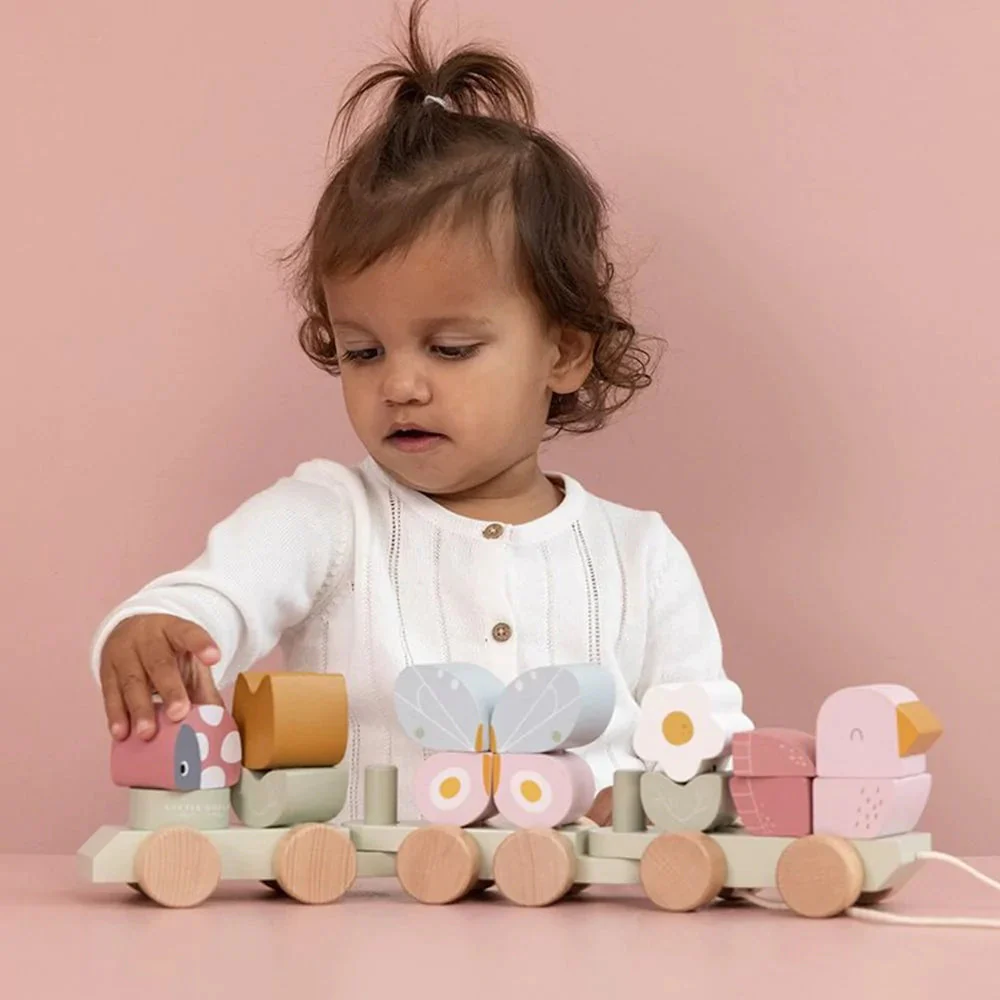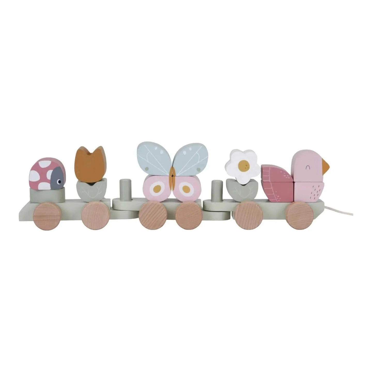 Αυτό το ξύλινο τρένο είναι έτοιμο για μια νέα περιπέτεια στον ανθισμένο κήπο. Το μικρό ροζ πουλάκι Olivia θα σας δείξει τα πιο όμορφα λουλούδια και τις πιο παιχνιδιάρικες πεταλούδες. Χρησιμοποιήστε τη φαντασία σας για να φτιάξετε το τρένο χρησιμοποιώντας τα στοιβαγμένα μπλοκ σε διάφορα σχήματα και ονειρικά χρώματα. Υπάρχουν 3 άμαξες για στοίβαγμα με ένα πουλί, λουλούδια, πεταλούδα και πασχαλίτσα. Προκαλέστε το μικρό σας να δημιουργήσει διαφορετικούς συνδυασμούς για να υποστηρίξει τον συντονισμό χεριού-ματιού και τις λεπτές κινητικές δεξιότητες.Περιλαμβάνει 17 κομμάτια