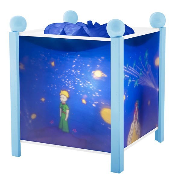 Επιτραπέζιο φωτιστικό με θέμα τον Μικρό Πρίγκιπα<, που περιστρέφεται και την νύχτα φαίνονται εκτός από τον πρίγκιπα οι φτερωτές από το φίλμ στην οροφή. Φωτιστικό ασφαλείας με μετασχηματιστή (220VAC σε 12VAC). Ασφάλεια: Είναι αντικείμενο διακόσμησης. Δεν είναι παιχνίδι.  Από την γαλλική εταιρεία Trousselier.