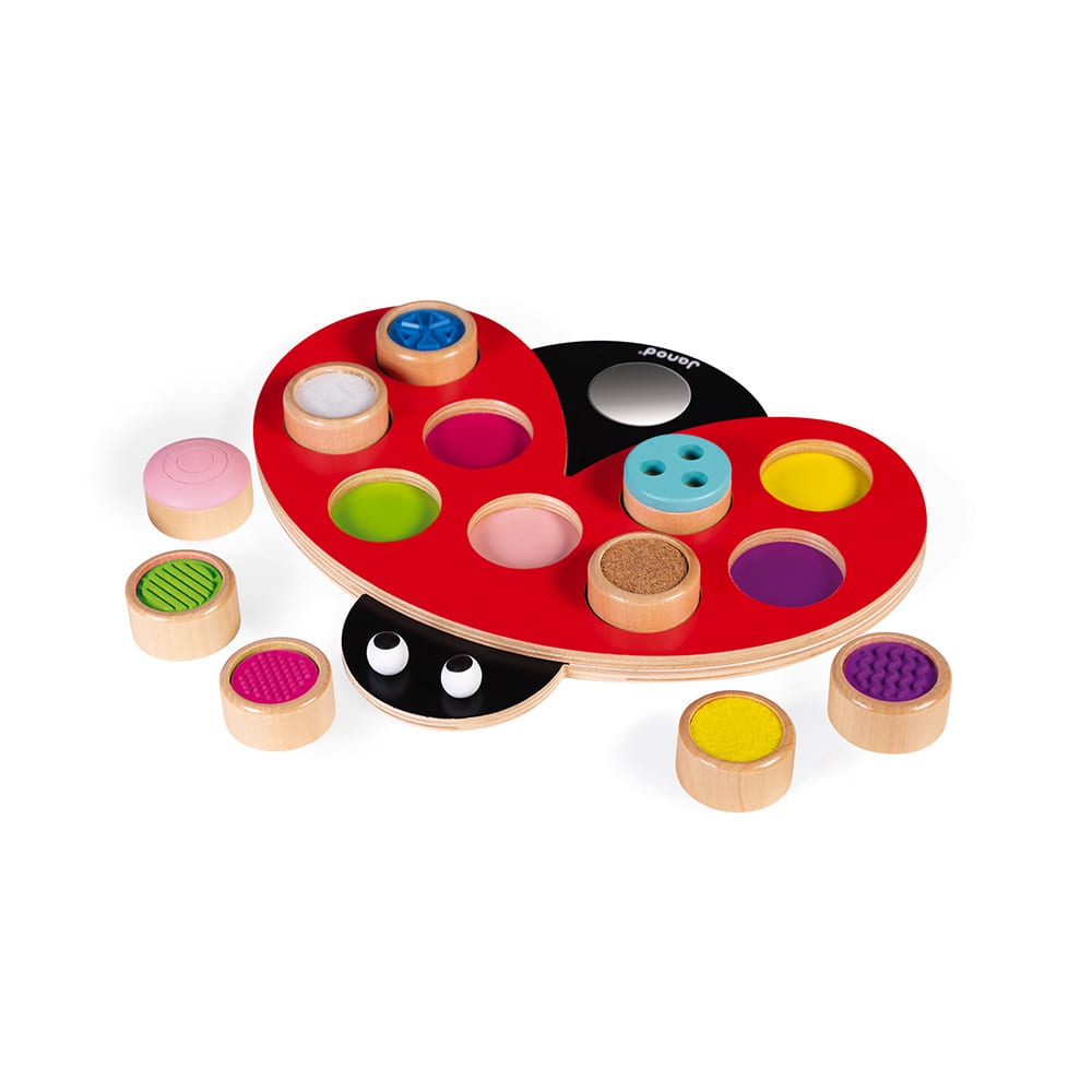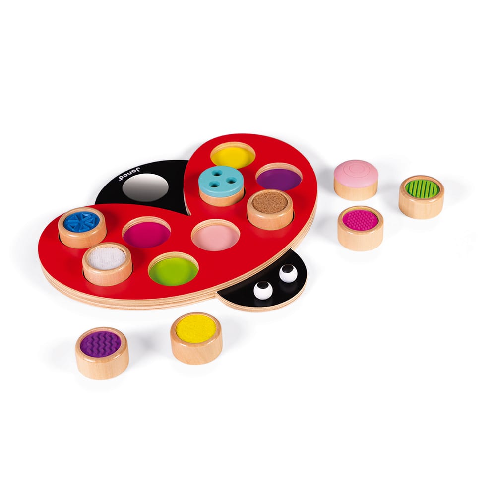 Αυτή η μικρή πασχαλίτσα είναι ιδανική για να βοηθήσει το παιδί σας να αναπτύξει την αίσθηση της αφής! Τα 9 στρογγυλά κομμάτια έχουν διαφορετική υφή το καθένα (ανάγλυφο, ξυλογραφία, φελλός, βελούδο και σκρατς), προσφέροντας ατέλειωτες ώρες ψυχαγωγίας. Θα βοηθήσει το μικρό σας να συσχετίσει τα χρώματα των στρογγυλών κομματιών με τις βούλες της πασχαλίτσας. Επιπλέον, θα μπορεί να κοιτάζεται στον καθρέφτη. Υδατογραφία. Εκτύπωση: Μεταξοτυπία. Ξύλο πιστοποιημένο από το FSC (Συμβούλιο Διαχείρισης Δασών): κόντρα πλακέ για την πασχαλίτσα και μασίφ ξύλο για τα στρογγυλά κομμάτια. Συσκευασία δώρου.