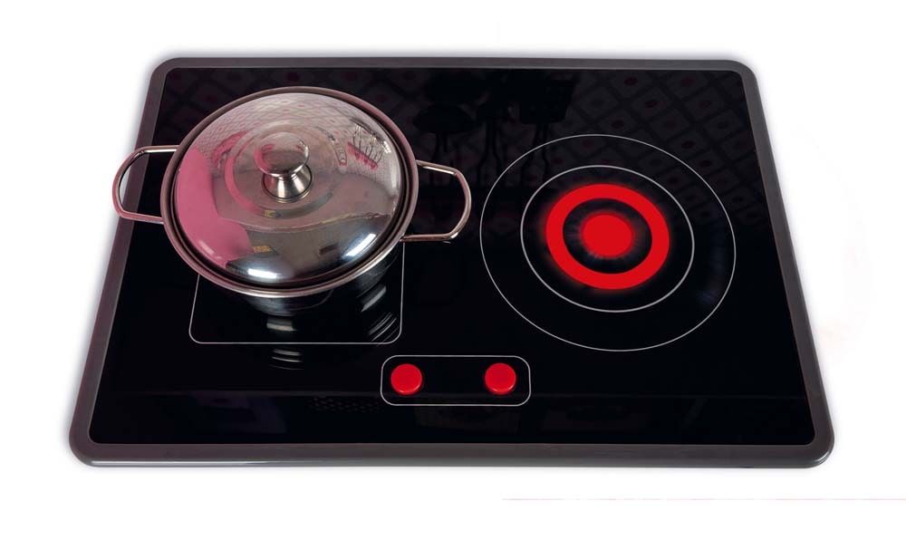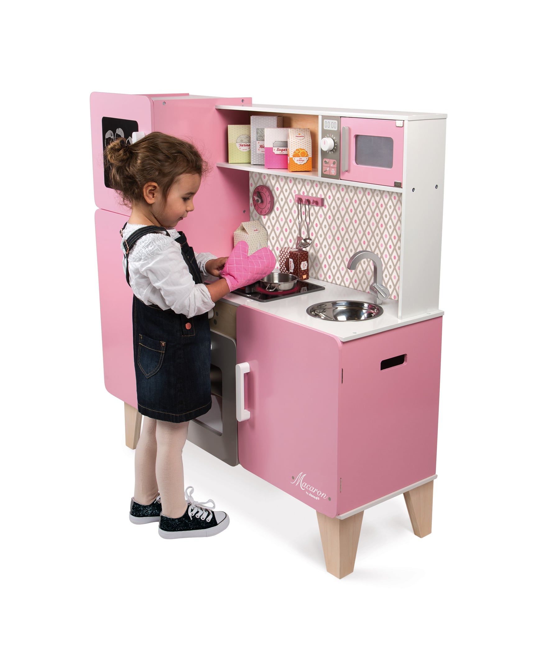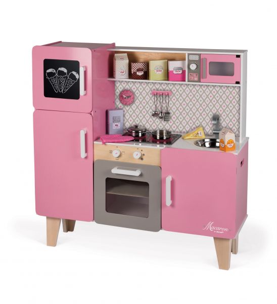 Cook delicious dishes for your friends, like mom and dad, and become a little chef! The Large Macaron Kitchen is made of wood and comes with a set of hangers to hang 3 metal spoons, 1 metal pot, 1 metal pot with a lid, an oven mitt, a fried egg and 7 cardboard food boxes (cocoa, sugar, orange, flour, cheese, milk and rice). Like a real kitchen, it has a cooking surface with LED lights and sound effects: just press the red buttons once to light up the eyes, then a second time to hear the water boil. The eyes and sound turn off by themselves after 30 seconds or if you press the red buttons a third time. This fantastic fully equipped kitchen also features an oven, microwave, cupboard and fridge with magnetic doors, 3 knobs with sound effects, stainless steel sink, a clock and a blackboard. Workbench height: 57 cm. Wood: MDF (printed parts), plywood (inner shelf), stainless steel (sink, screws). Printing: matte thermal printing. Closed cardboard box with printed poster on the front. Polystyrene sleeves inside the box and plastic protectors for maximum safety during transport. Assembly required.